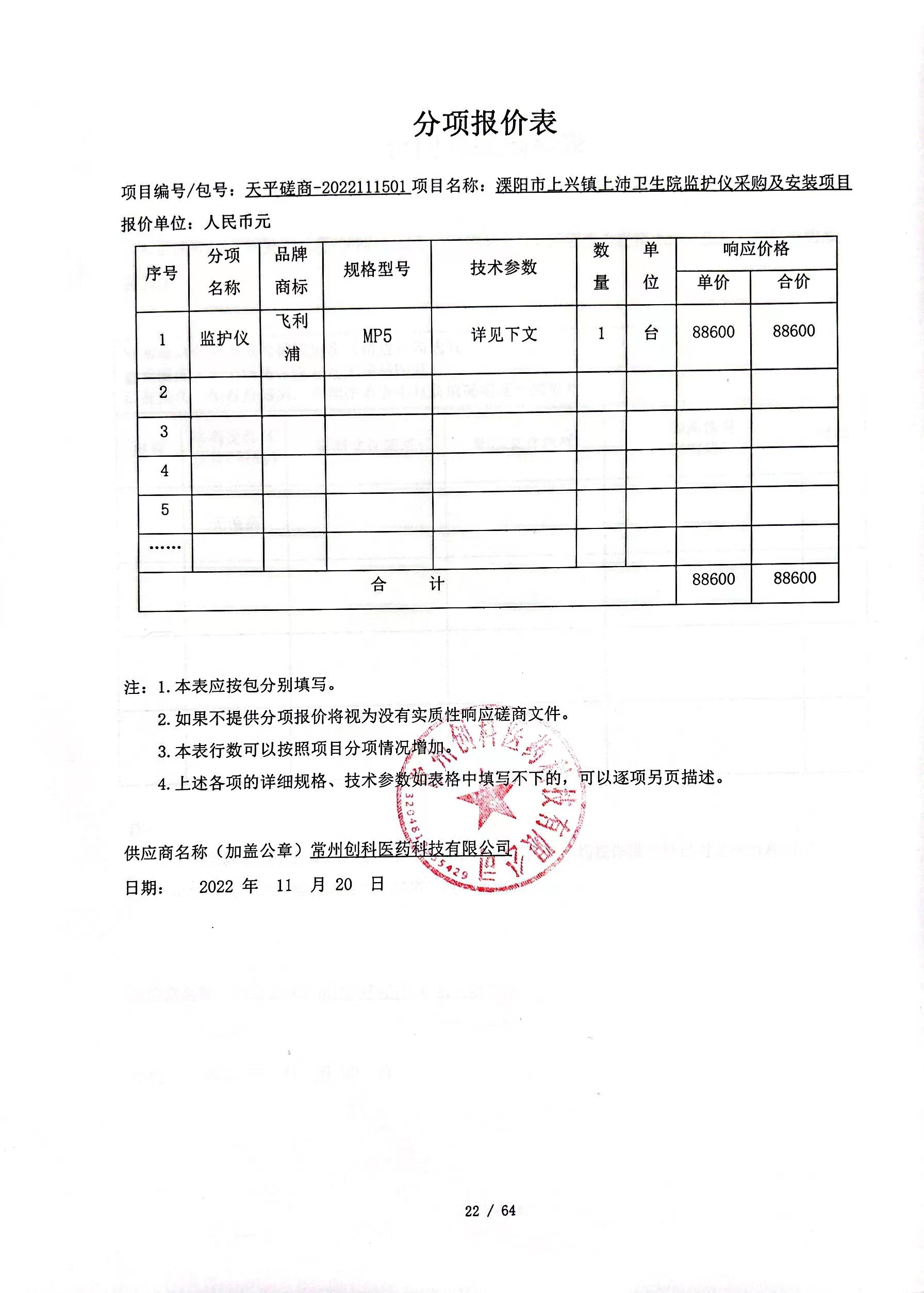 名称:溧阳市上兴镇上沛卫生院监护仪采购及安装项目 品牌:见附件 规格型号:见附件 数量:1台 单价:见附件 |